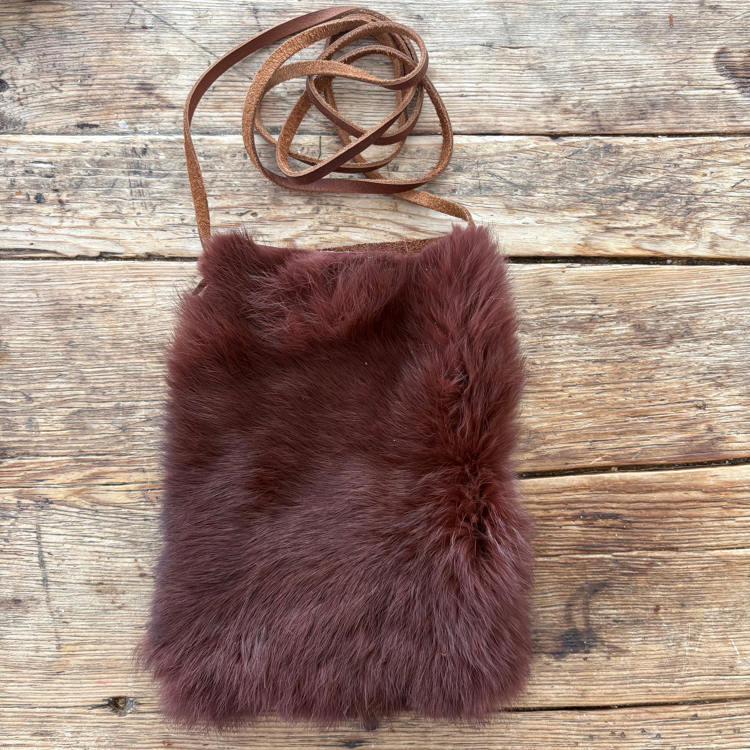 Style: Cordovan Rabbit / Cordovan Leather with long cross body strap with accent beads.