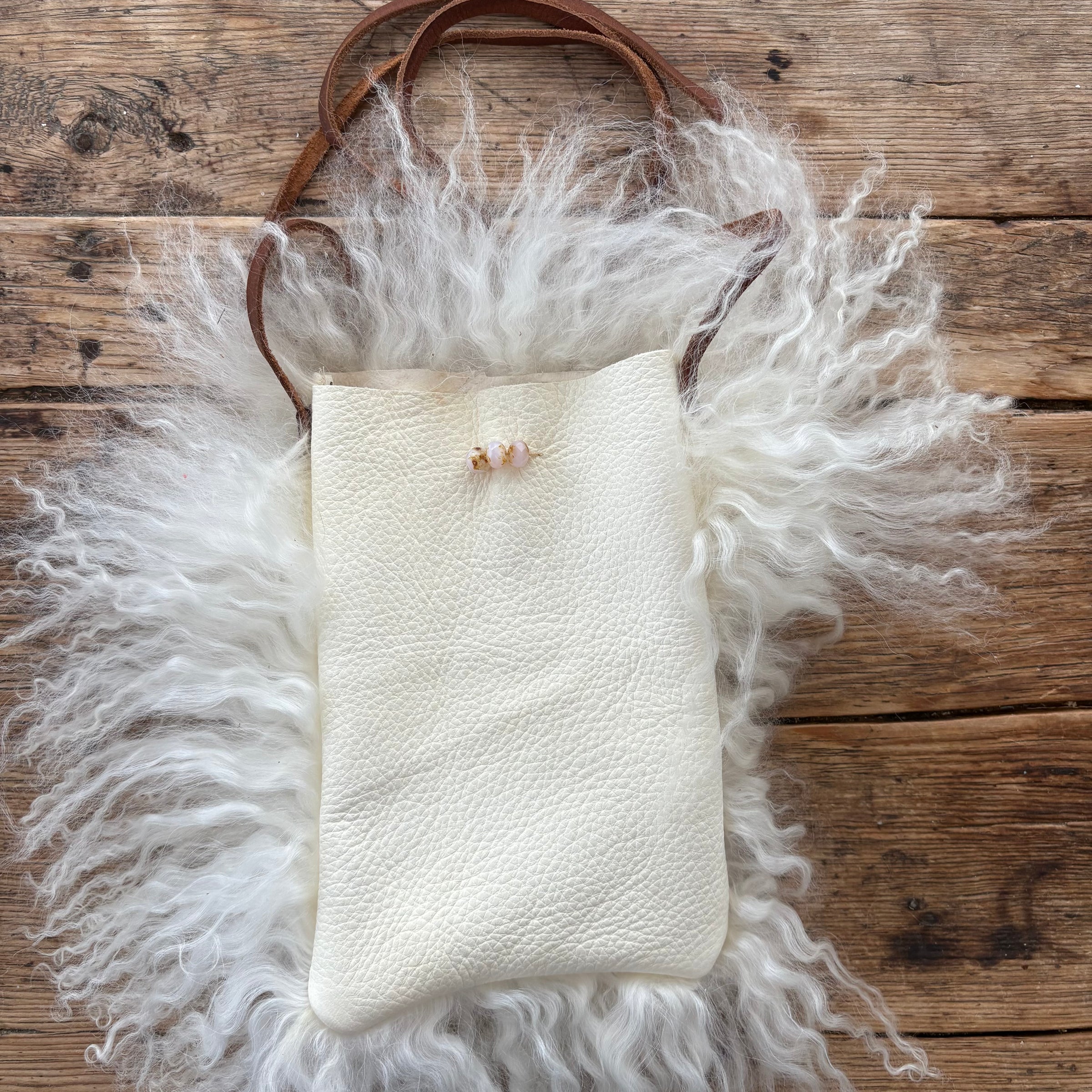 Style: Ivory Mongolian Fur / Ivory Leather with long cross body strap. Pink Bead Accent