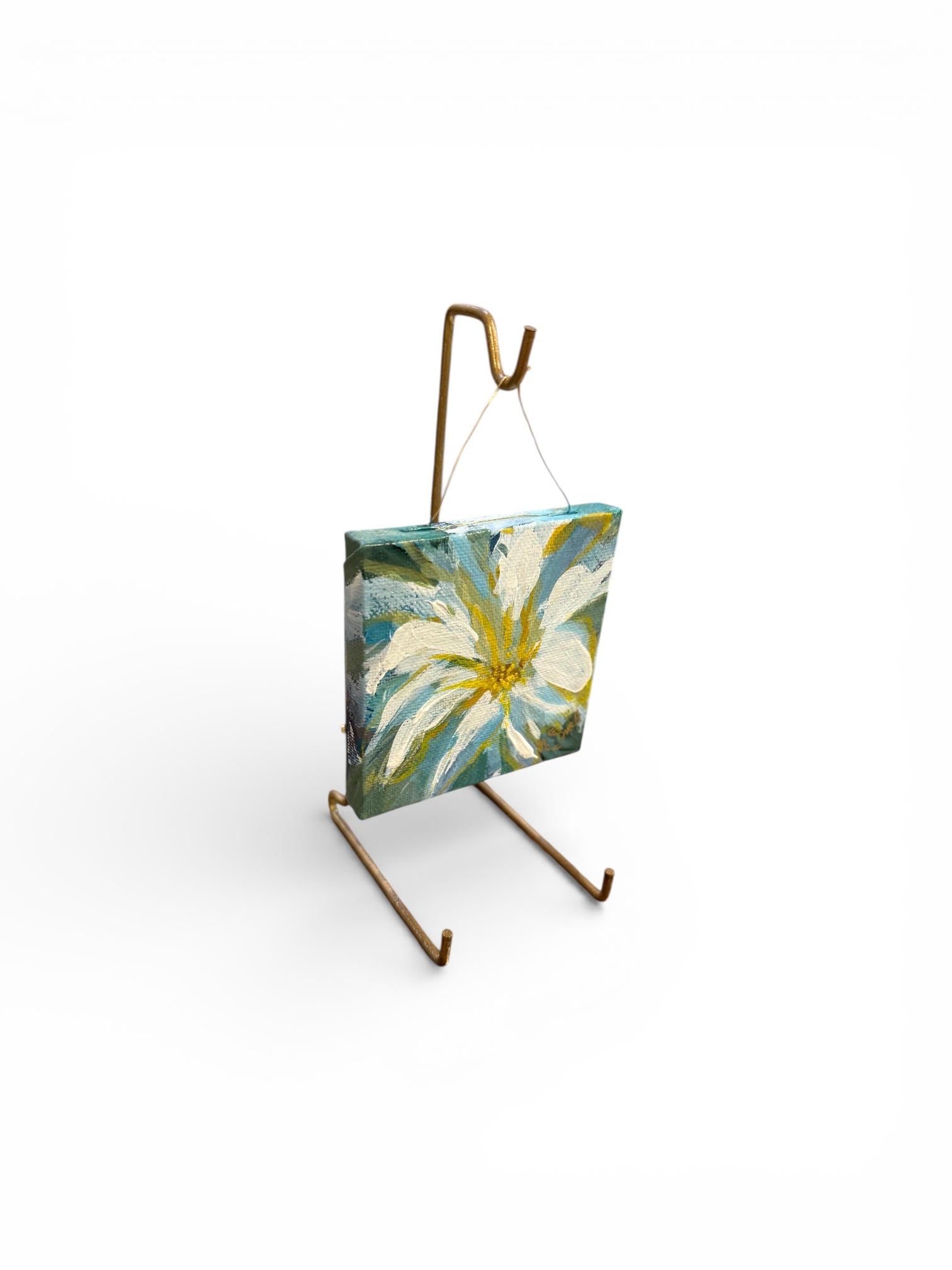 This sweet impressionistic painting of a flower will add a "fresh touch" of color to a desk, book shelf or counter. It comes ready to display with it's own hanger/easel.
