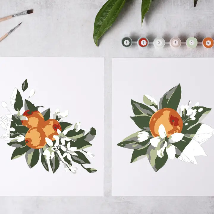 This Orange Blossoms paint by number includes three numbered outlines and coordinating paints. Makes for a fun and relaxing activity and your finished paintings are suitable for hanging and enjoying for years to come. I T E M • 2 canvas board outlines • 8x10in size • 2 paintbrushes, small and large • acrylic paint pots, numbered to match the painting outlines