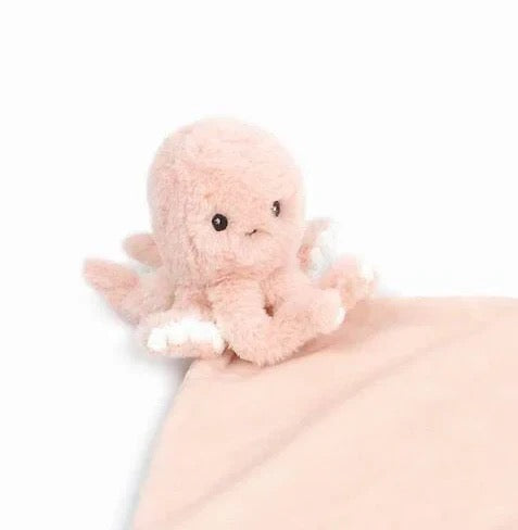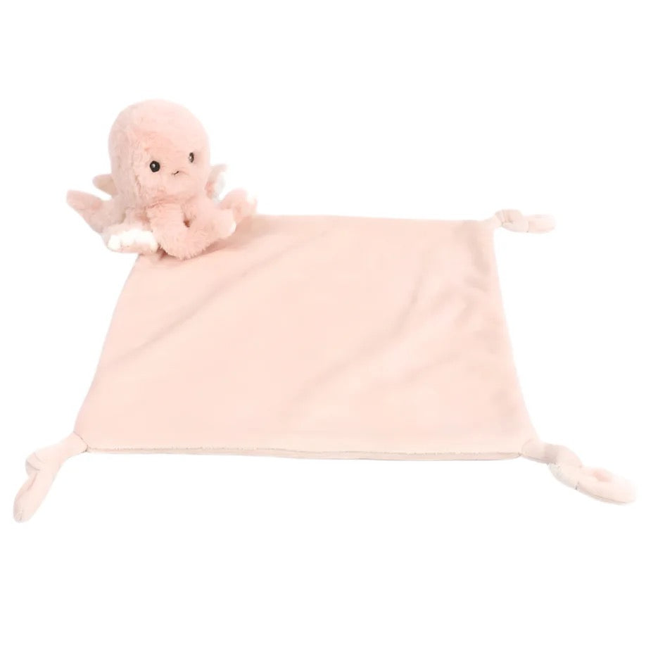 Baby's new favorite blankie! A child forms an instant bond with his or her security blanket and this plush animal blanket is full of fun. Mon Ami's luxuriously soft Odessa Octopus Security Blanket features knotted ends and Odessa the Octopus herself for tactile stimulation. Machine washable and designed in a pretty blush pink, our plush animal blanket gives a baby plenty to grab on to. This sweet security blanket is a standout gift for a baby shower, baptism or newborn celebration