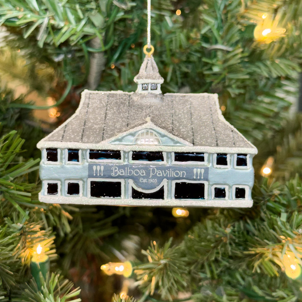 Bring a piece of coastal elegance to your holiday decor with our stunning glass-blown Christmas ornament, inspired by the historic Balboa Pavilion.