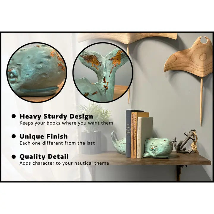 Spruce up any ocean, beach, or nautical themed decor with this rustic set of Verdigris Whale Bookends. This durable and dependable duo are crafted from cast resin to give each piece a detailed and hand painted verdigris finish with a unique touch of personality that you won't find anywhere else. Each piece measures 4.5 inches long by 4.25 inches wide by 3.5 inches high in the front, and 5.5 inches long by 3 inches wide by 4.75 inches high in the tail. Not only is this set perfect for light reading on bedside nightstands, organizing cookbooks in the kitchen, and adding a salty touch of sea worthy style to any home office, but they also make a unique house warming gift for whale enthusiasts and sea loving friends alike.