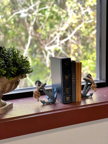Bring a splash of nautical style to your home with this set of two classic boat anchor book ends. Crafted from heavy and durable cast iron, the nautical blue enamel finish and twine accents give this pair a classic look that compliments a variety of home decor styles. Perfect for use on a bookshelf, desk, or end table as either an accent piece or functional decor. Each anchor measures 4.5 inch long, 3.25 inch wide, 4.75 inch high. Great as a gift for yourself or your sea loving friends and family.