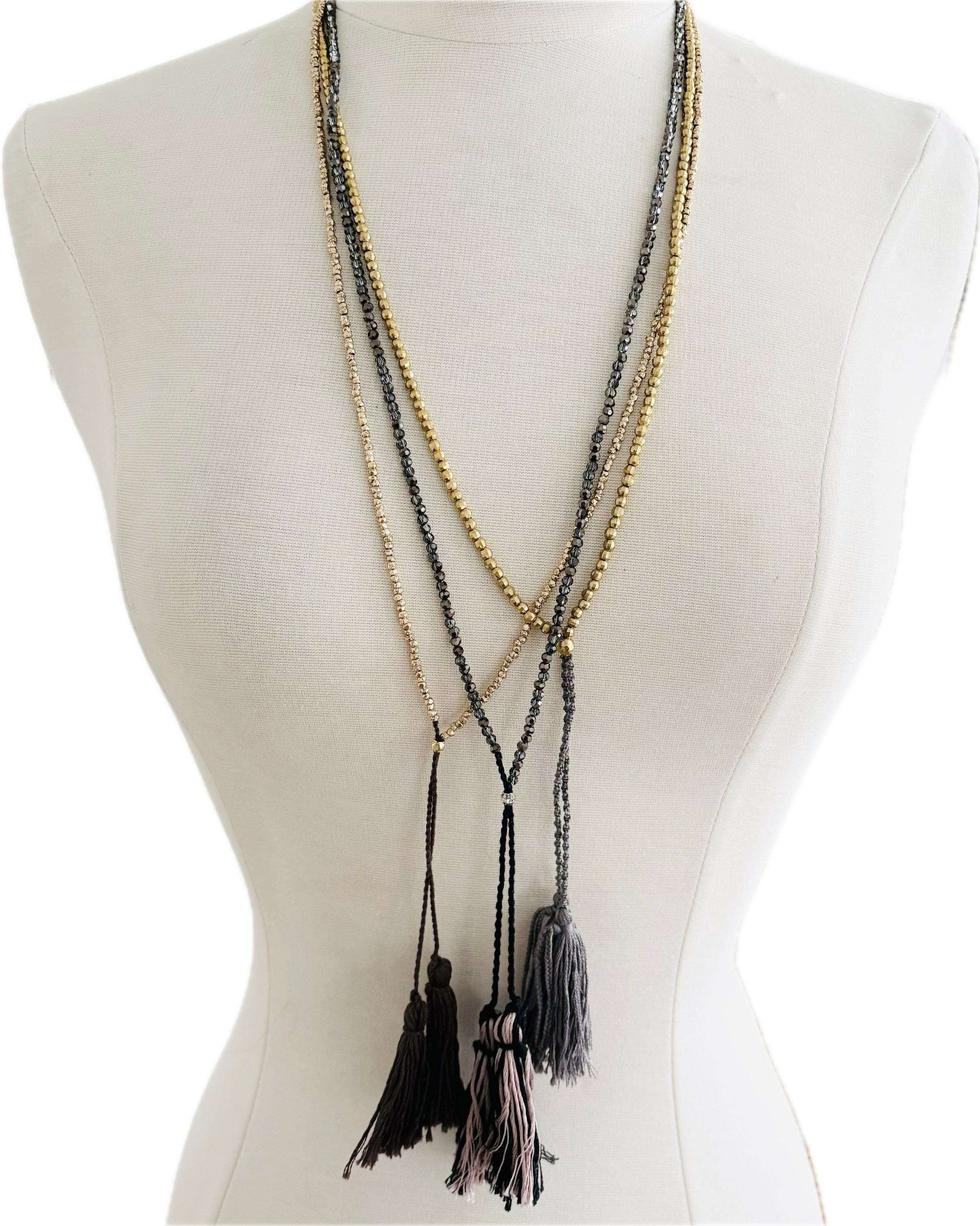 Elevate your style with this TASSEL ON CRYSTAL NECKLACE. Made in CA and designed in France, this necklace features a stunning crystal stones and tassel, adding a touch of elegance to any outfit. With a length of approximately 32 inches, it's the perfect addition to your jewelry collection.