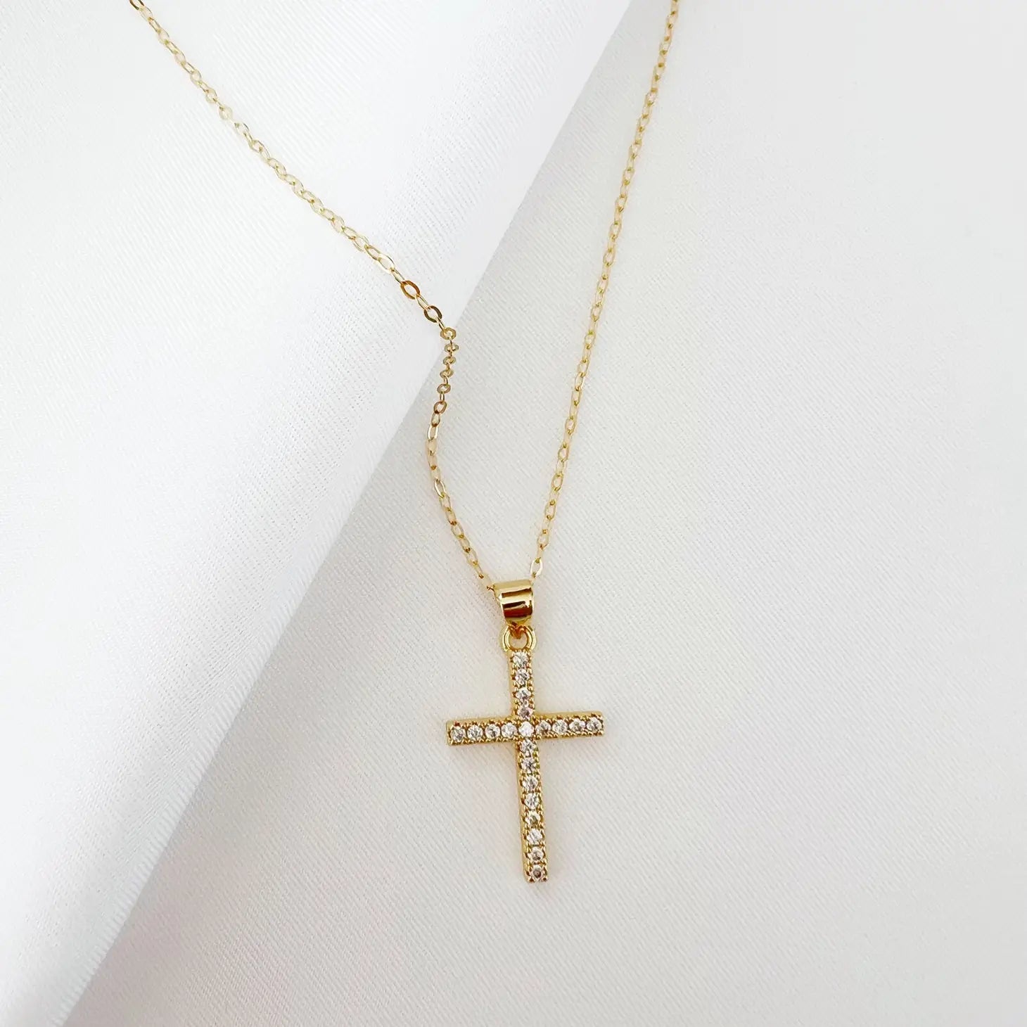 14K Gold filled baguette cross charm or 14k gold filled pavé cross pendant strung on our signature 14k gold filled cable chain. strung on a high quality 14/20 14k gold filled dainty figaro chain.