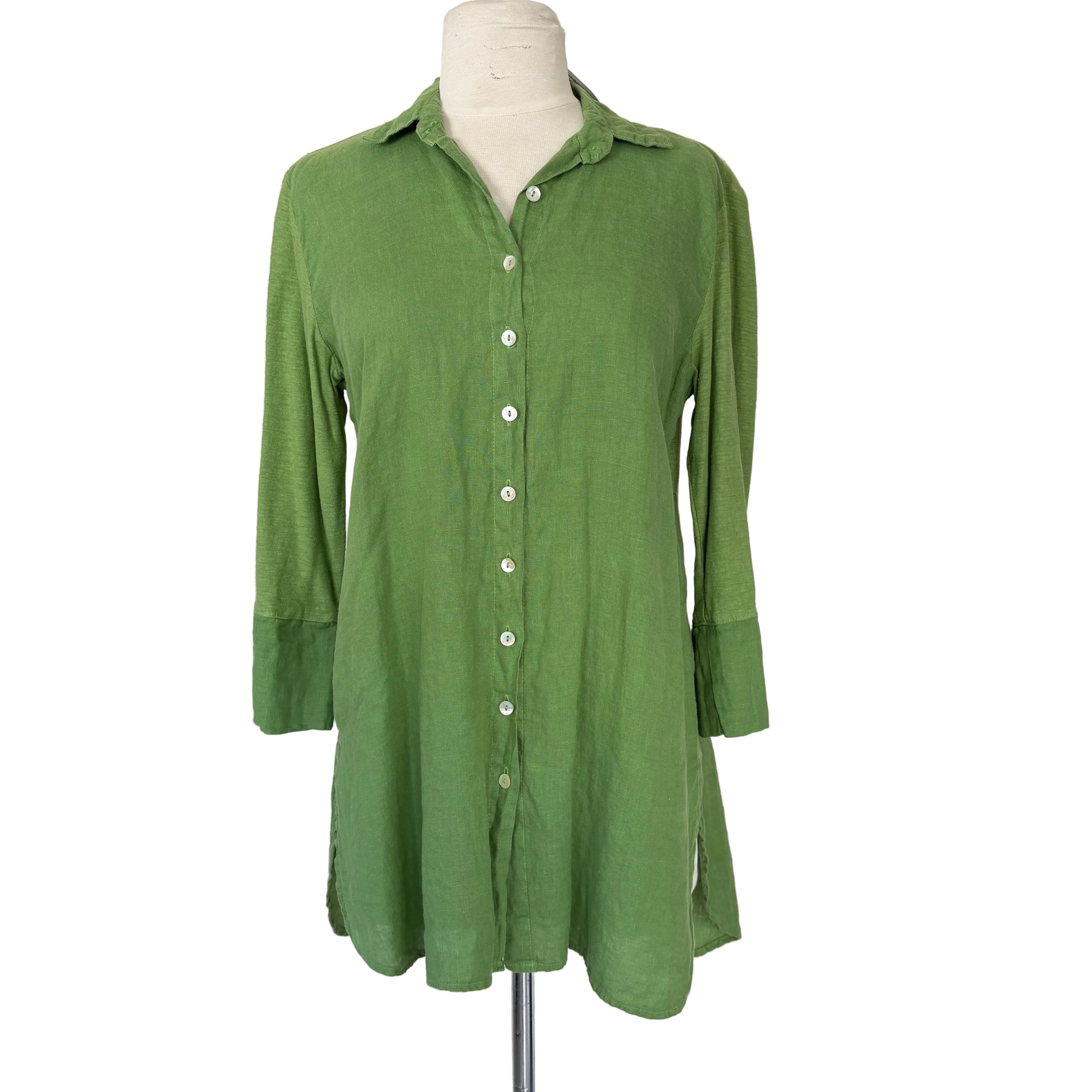 Cut Loose Green Button down Shirt with Knit Sleeves and Back detail.