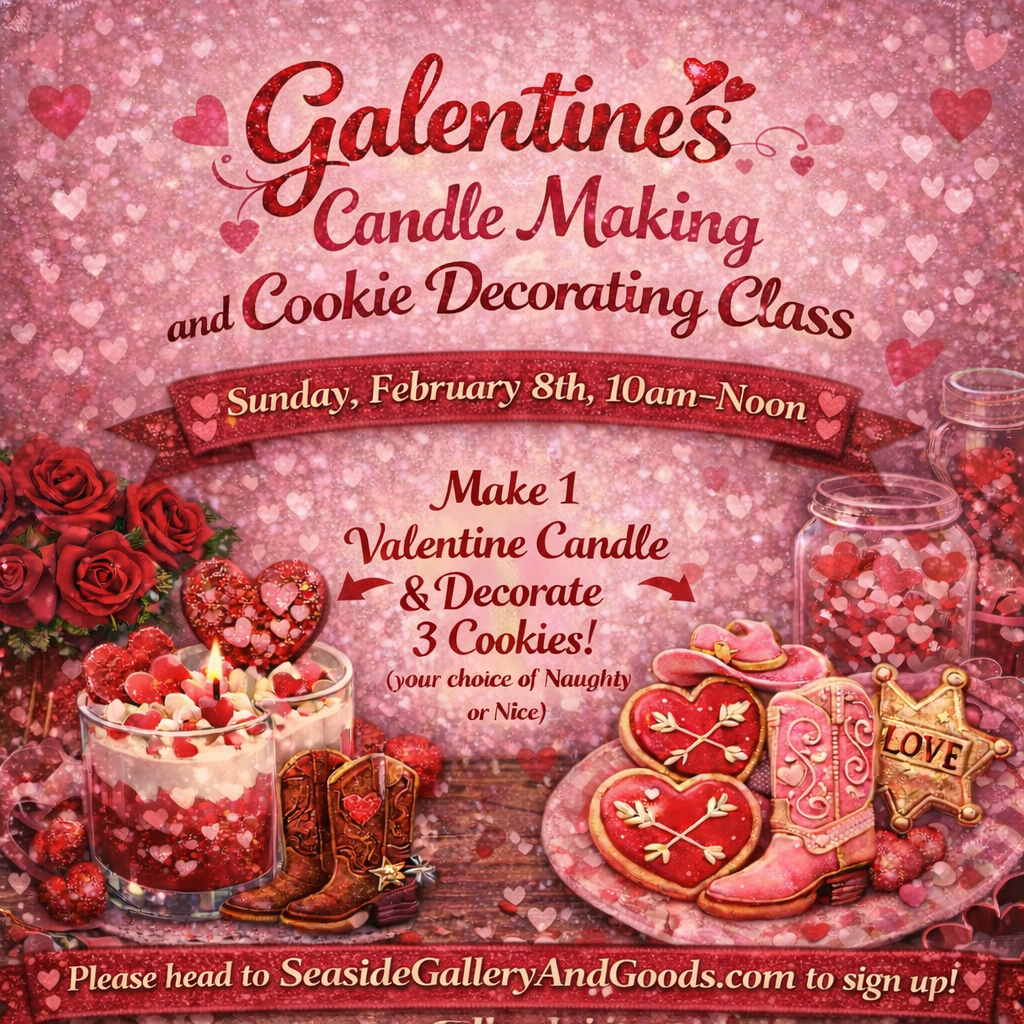 Grab your favorite GALENTINES for a fun, cowgirl + valentine themed workshop duo - candle making and cookie decorating!