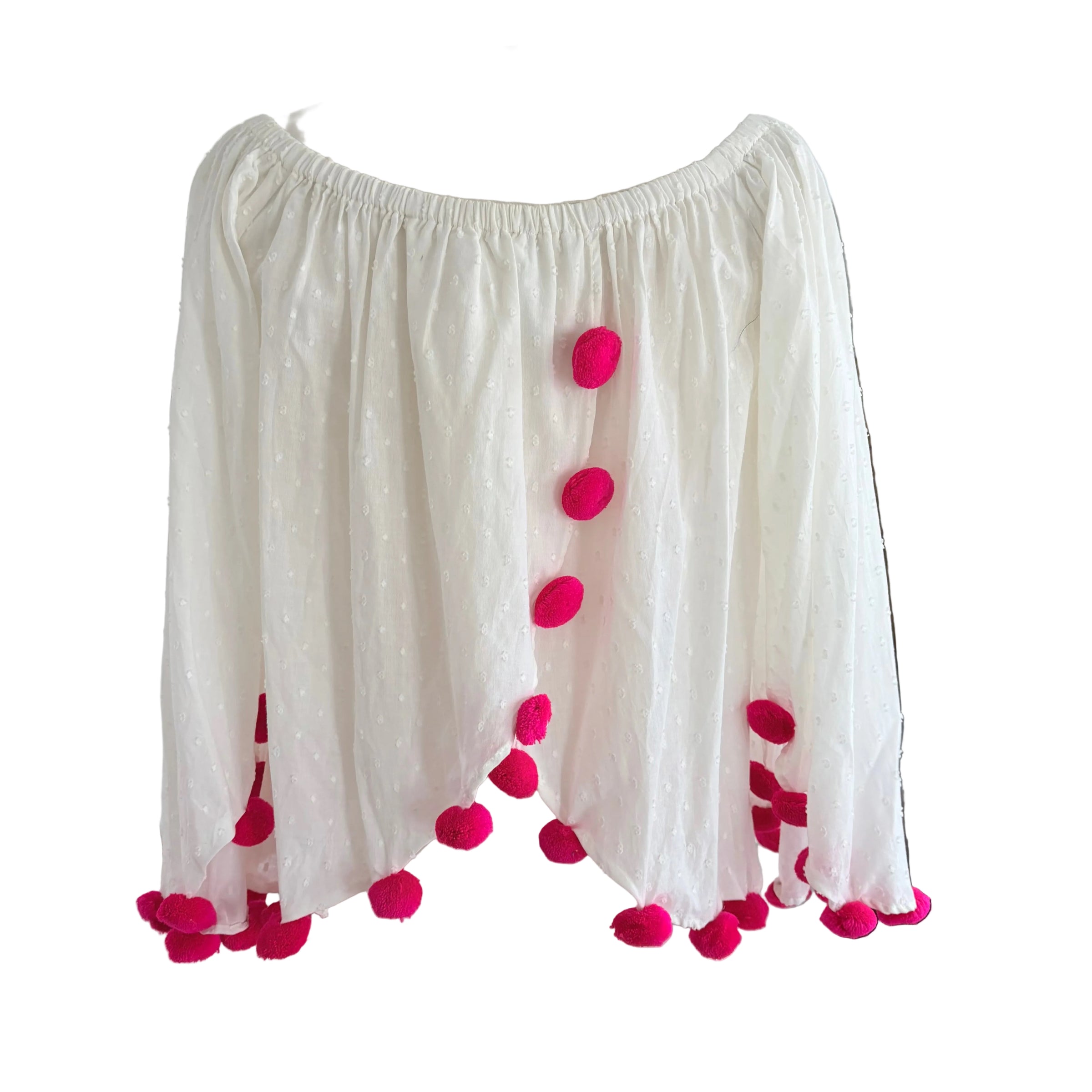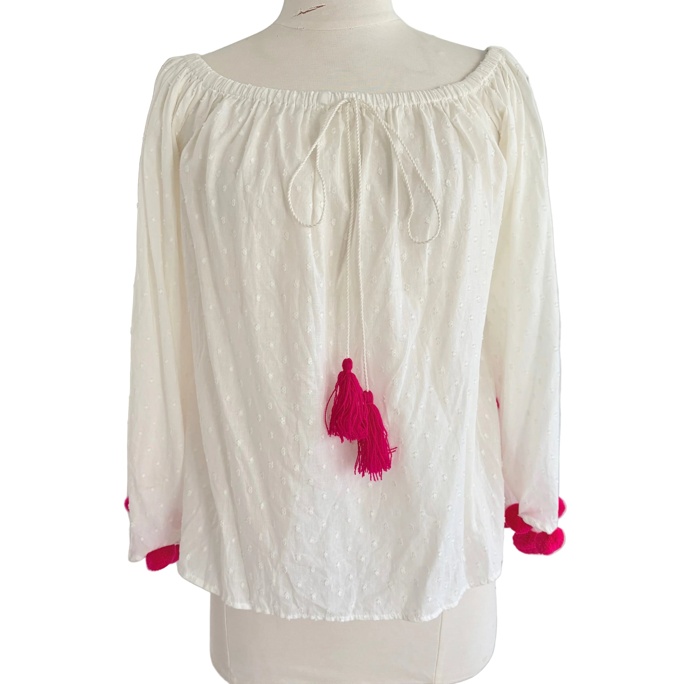 Ivory Cotton Top with tassel cord in front and pom poms in back and on sleeve
