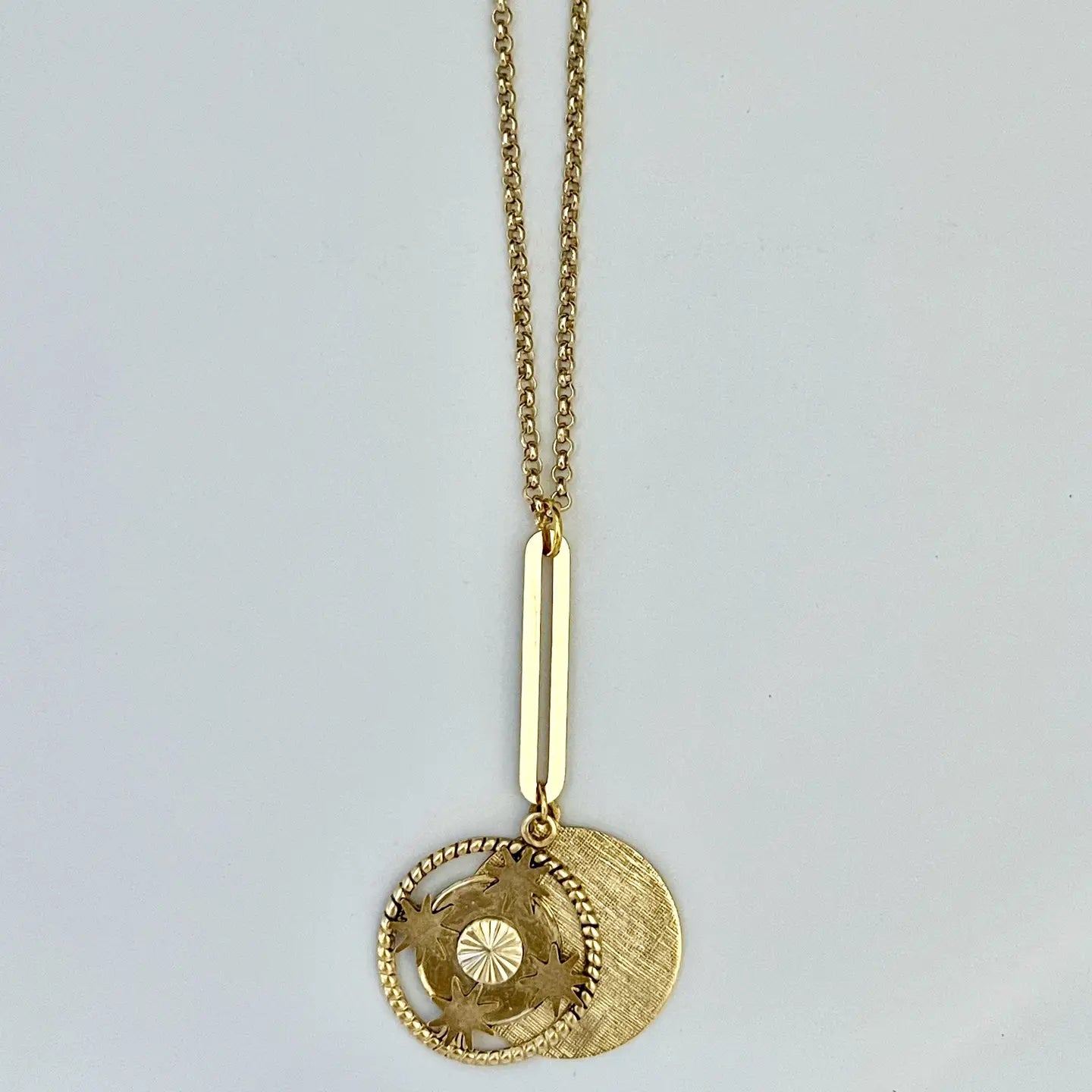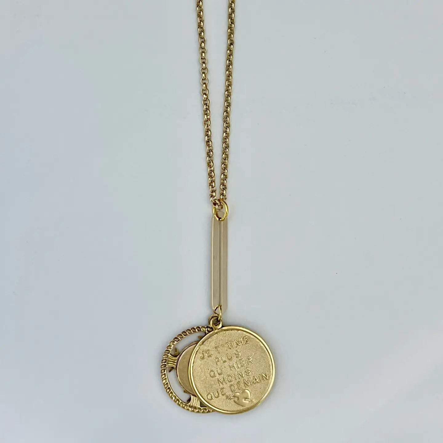 This necklace offers versatility. A compass with suns for each direction on one side and the cherished French phrase, "I love you more than yesterday and less than tomorrow," on the other, making it a meaningful accessory. * Gold plated over brass * 18"L * Handmade in NYC