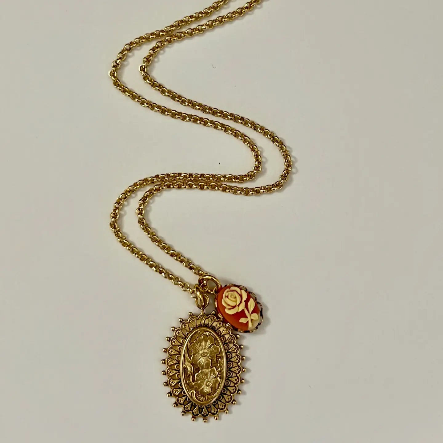 * Resin cabochon * Gold plated over brass * 18"L * Handmade in NYC Indulge in the breathtaking beauty and details of this exquisite double medallion necklace.