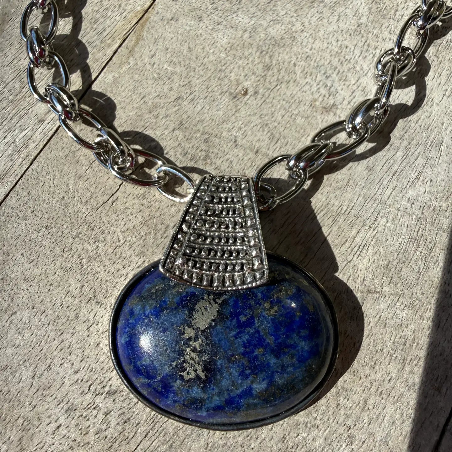 Large 2.5" wide pendant with silver pewter bezel and ornamental bale, lays perfectly on this mixed chunky silver plated chain. Genuine stone, real power, stoic, inner power, inner strength, humble yet confident, that is lapiz. large hook clasp,