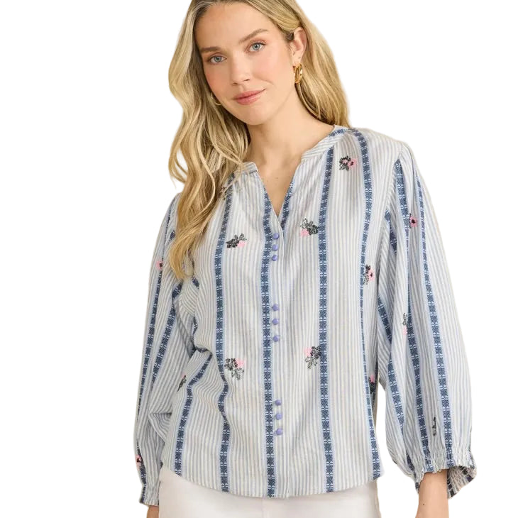 Madres Blue Stripe Mandarin Collar 3/4 Sleeve Button Down Blouse