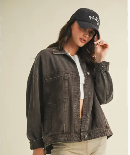 This slightly distressed lightweight denim jacket has a fall vibes 'black coffee' wash and cute back pleat detail.